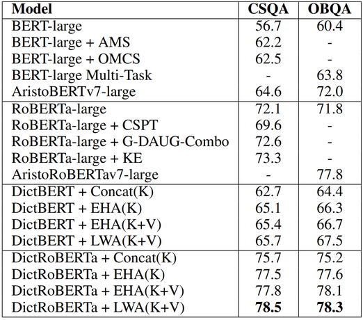 During inference, DictBERT is used as a plugin. Given a sequence that needs to be encoded, one first computes the original encoding from a normal BERT. Then, in parallel, one extracts selected entries from the input sentence, uses the dictionary to find descriptions for them, and encodes these descriptions with DictBERT. The authors have proposed several strategies for combining these entry encodings with the original encoding, resulting in higher quality representations (measured by performance on downstream tasks) compared to the bare encoder or other strategies of incorporating external knowledge, see the tables below. As the dictionary is finite, DictBERT is actually not needed at inference time, since one could simply store encodings of all descriptions in the dictionary and thus obtain a direct mapping from entry to encoding. All that is left at inference is then to combine encodings of selected entries with the original encodings (see comment on this below).