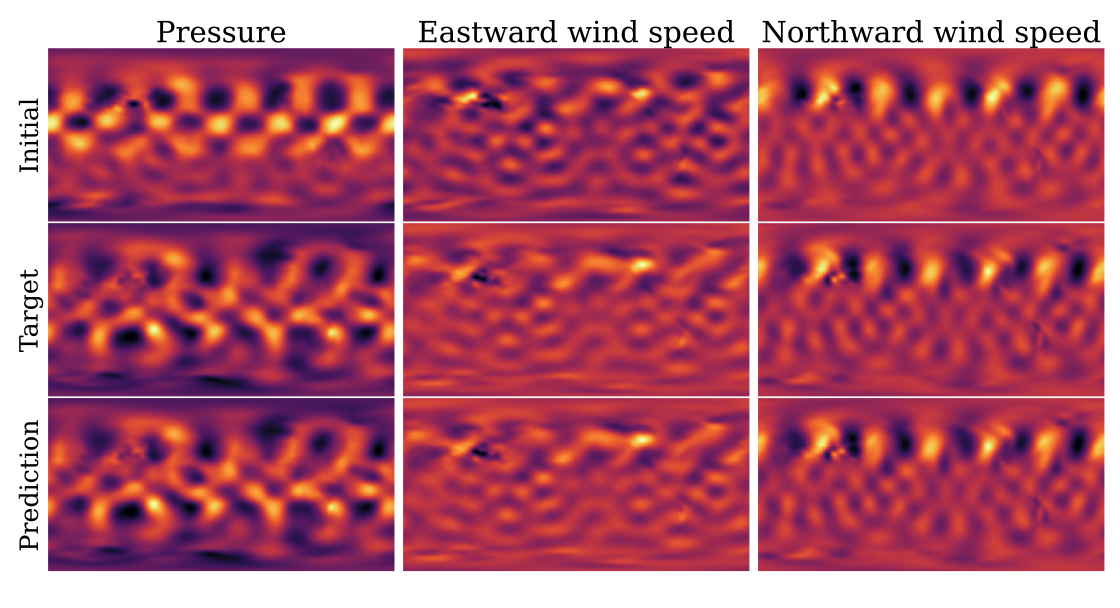 Example input, target, and predicted fields for the shallow water equations. Predictions are obtained by the GCA-UNet model when using 16384 training trajectories.