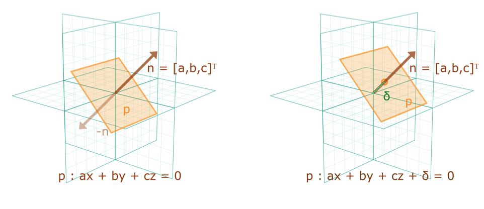 ax+by+cz=0$ .Right,a general plane represented by a unit normal vector $n$ and distance $\delta$, or equivalently by the linear equation $p:ax+by+cz+\delta=0$.