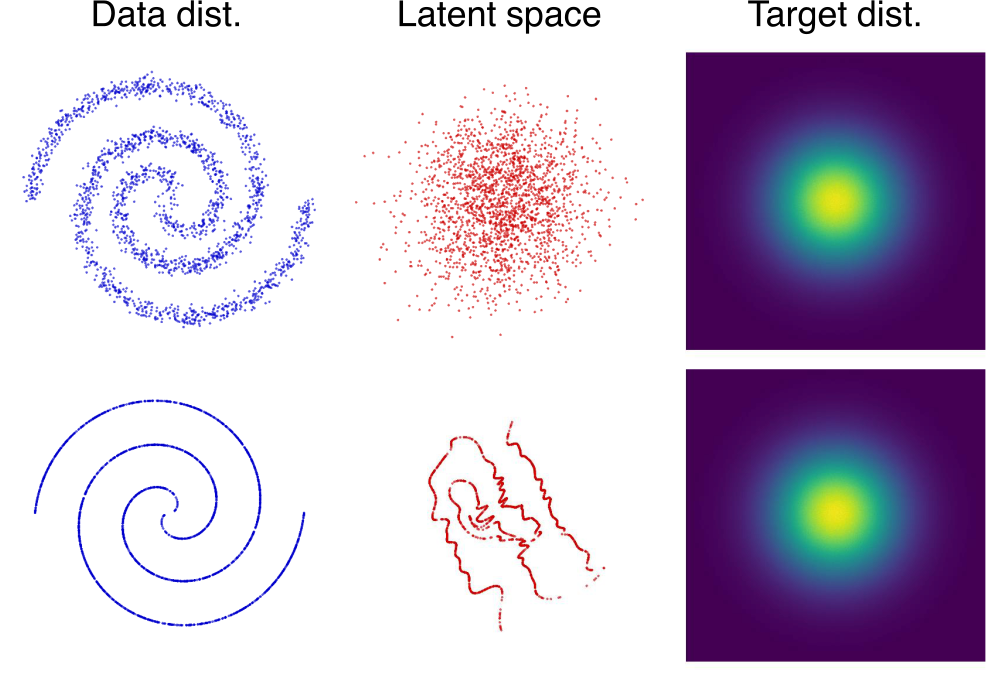 Illustration of a normalizing flow trained on 2D data (top) and a 1D manifold
