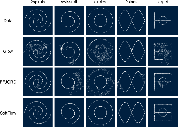 Samples from SoftFlow, Glow, and FFJORD trained on 5 different distributions.
