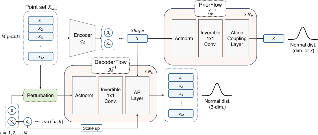 decoder, implemented as SoftFlow computes the likelihood of the point cloud